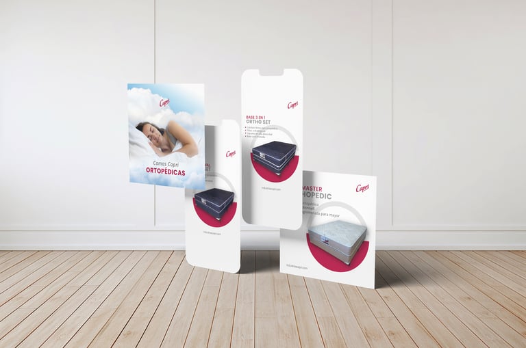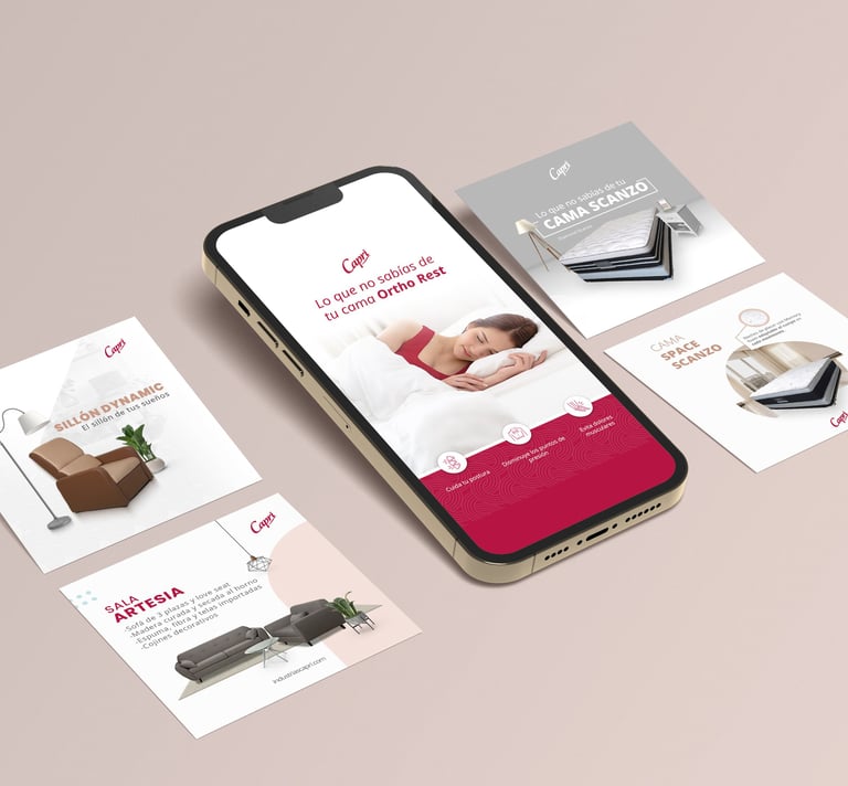 Creé piezas estáticas y videos promocionales que reflejan calidad, comodidad y confianza para las redes sociales de Capri, empresa líder en camas y muebles en Centroamérica.