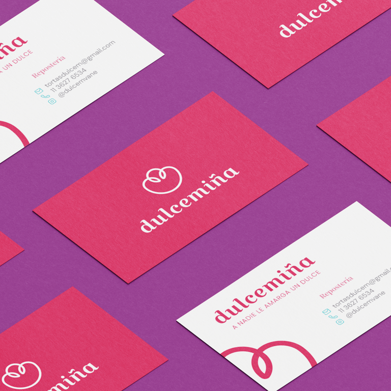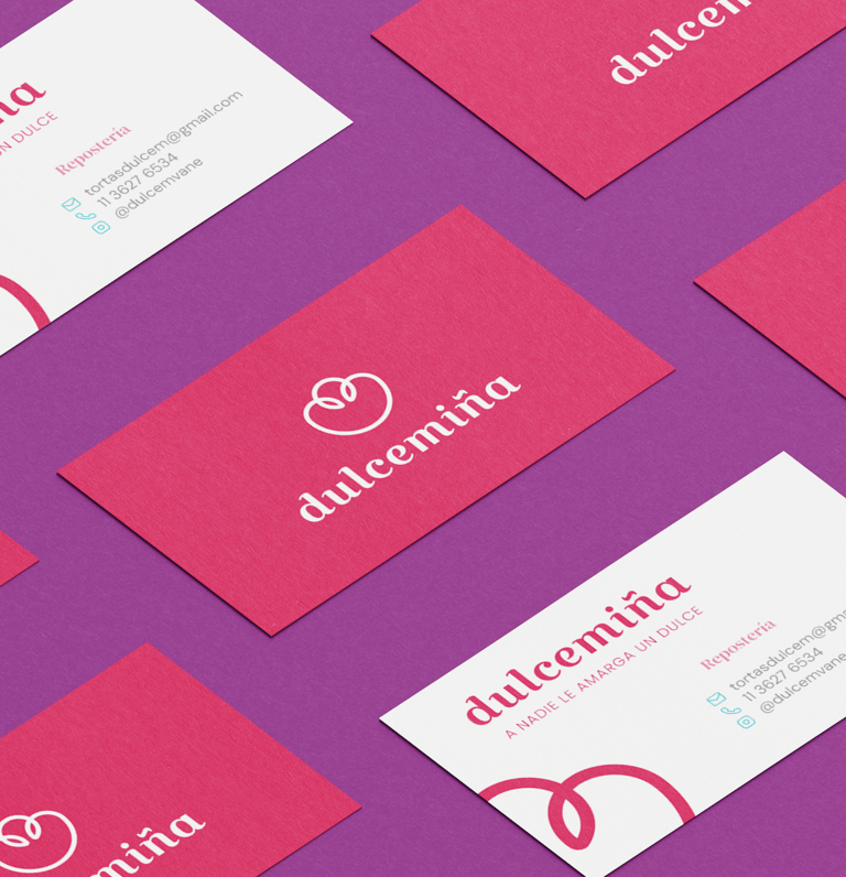 Dulce Miña es un emprendimiento dedicado a la elaboración de tortas personalizadas y todo lo relacionado con la pastelería, atendiendo a eventos como fiestas, cumpleaños, aniversarios y casamientos. La marca buscaba crecer, ser reconocida y atraer nuevos clientes, así como consolidar las recomendaciones de los clientes actuales. Para lograrlo, era fundamental diferenciarse de la competencia a través de una identidad visual distintiva y adaptable tanto para medios impresos como digitales, que reflejara la calidad del trabajo y los valores de la marca.