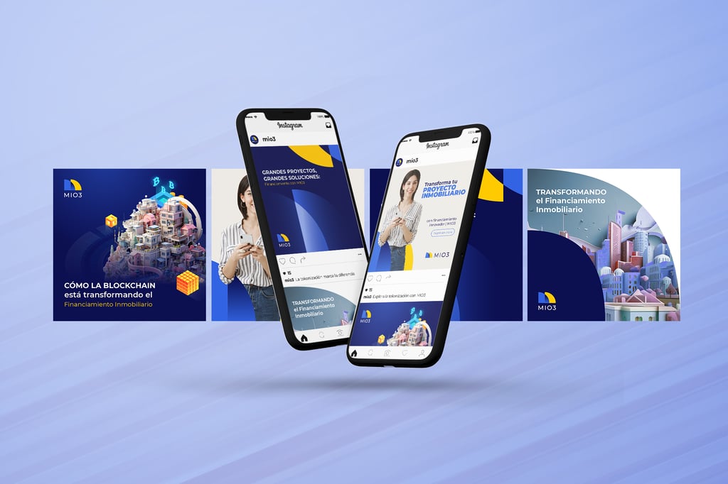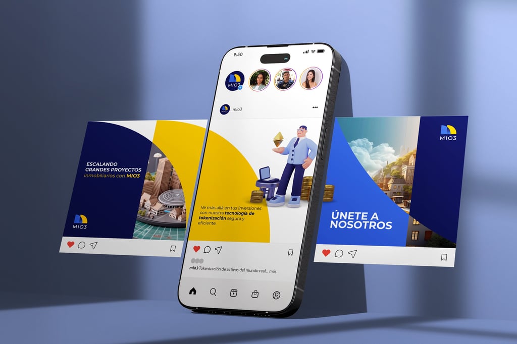 Empoderando la inversión a través de la tokenización de activos del mundo real. Diseño de Key Visuals para redes sociales alineadas con el branding de MIO3, una plataforma especializada en la tokenización de activos inmobiliarios.