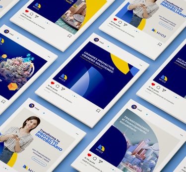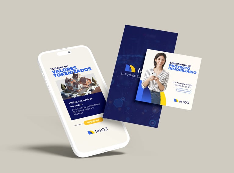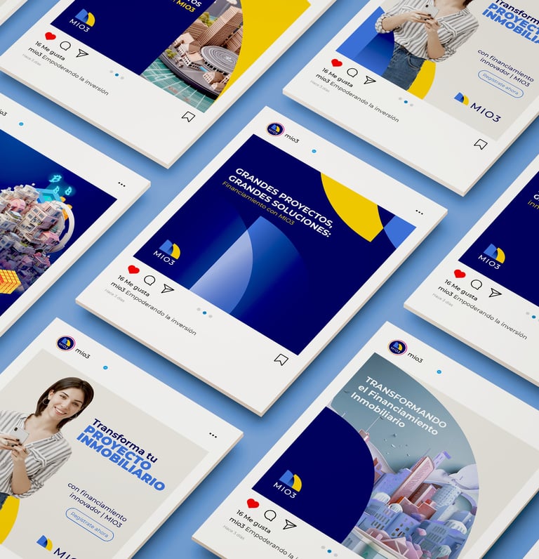 Analicé la marca y estudié a fondo la identidad visual de MIO3 para asegurarme de que el diseño reflejara sus valores y estética. Para la conceptualización visual desarrollé un look & feel que integrara tecnología e inversión inmobiliaria, los colores y formas acordes a la marca. En el caso de la creación del sistema visual, establecí un conjunto de plantillas y lineamientos gráficos para mantener coherencia en la comunicación. Con respecto a los key visuals, diseñé piezas visuales claras y modernas para redes sociales, enfocadas en generar confianza y profesionalismo.