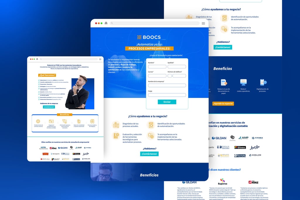 Analicé la marca existente de BOOCS para identificar los elementos que transmiten profesionalismo, modernidad y confianza. Se usó la paleta de colores y tipografía establecidos en su identidad visual y así mantener la coherencia de la marca. Prioricé un diseño limpio y organizado que facilitara la lectura, permitiendo a la audiencia identificar rápidamente los servicios y ventajas de la firma. Además del diseño para sus redes sociales y videos con animación de gráficos, realicé dos landing pages con un enfoque centrado en la conversión. Cada página incluye un formulario de contacto prominente y bloques de contenido claros y concisos. Los beneficios y las soluciones se muestran de forma visual y esquemática, reforzando la propuesta de valor de BOOCS y facilitando la toma de decisiones por parte de los visitantes.