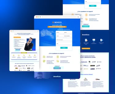Diseñé una serie de piezas gráficas para refrescar la imagen de BOOCS, estas resaltan la tecnología, experiencia y asesoría financiera de BOOCS y sirvieron como base y/o referente para futuros artes. Estas piezas tienen un diseño moderno y elegante, con mensajes directos que llaman a la acción y fomentan la confianza. Los videos mantienen la simplicidad, sobriedad, y seriedad requerida. Por otro lado, ambas landing pages (una enfocada en la automatización de procesos y otra en consultorías financieras) las creé para guiar al usuario de forma intuitiva, reforzar la identidad de BOOCS y optimizar la captura de leads.