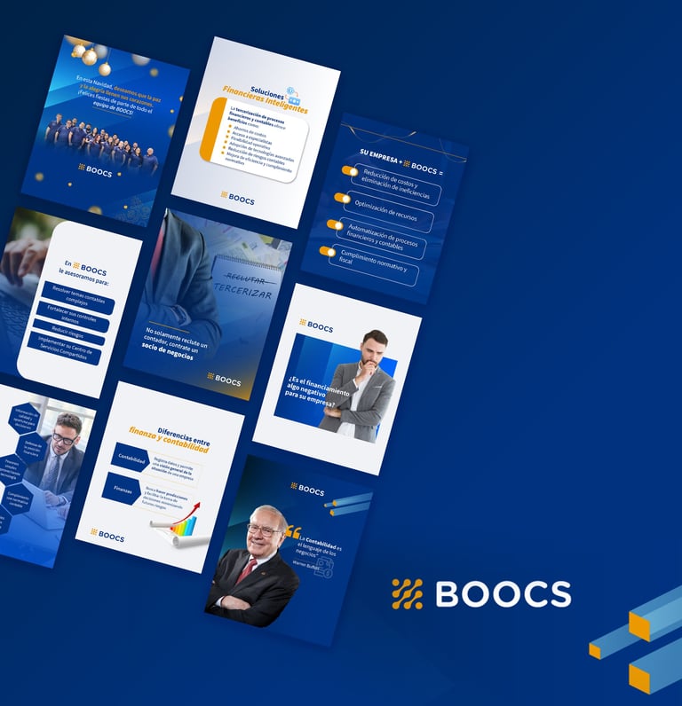 Rediseño y creación de artes publicitarios para BOOCS, una firma de BPO y consultoría especializada en la transformación de procesos de negocio.
